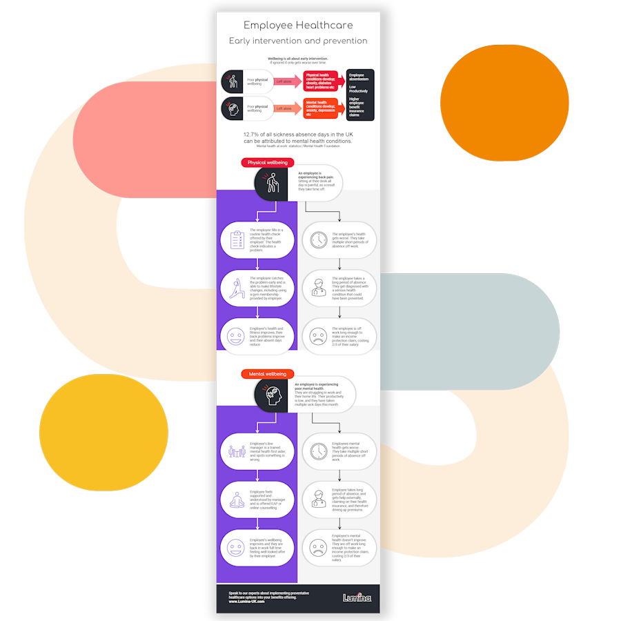 Wellbeing is all about early intervention. If ignored it only gets worse over time. This infograhic demonstrates the steps that can be taken to support your employees’ mental and physical wellbeing before it’s too late.